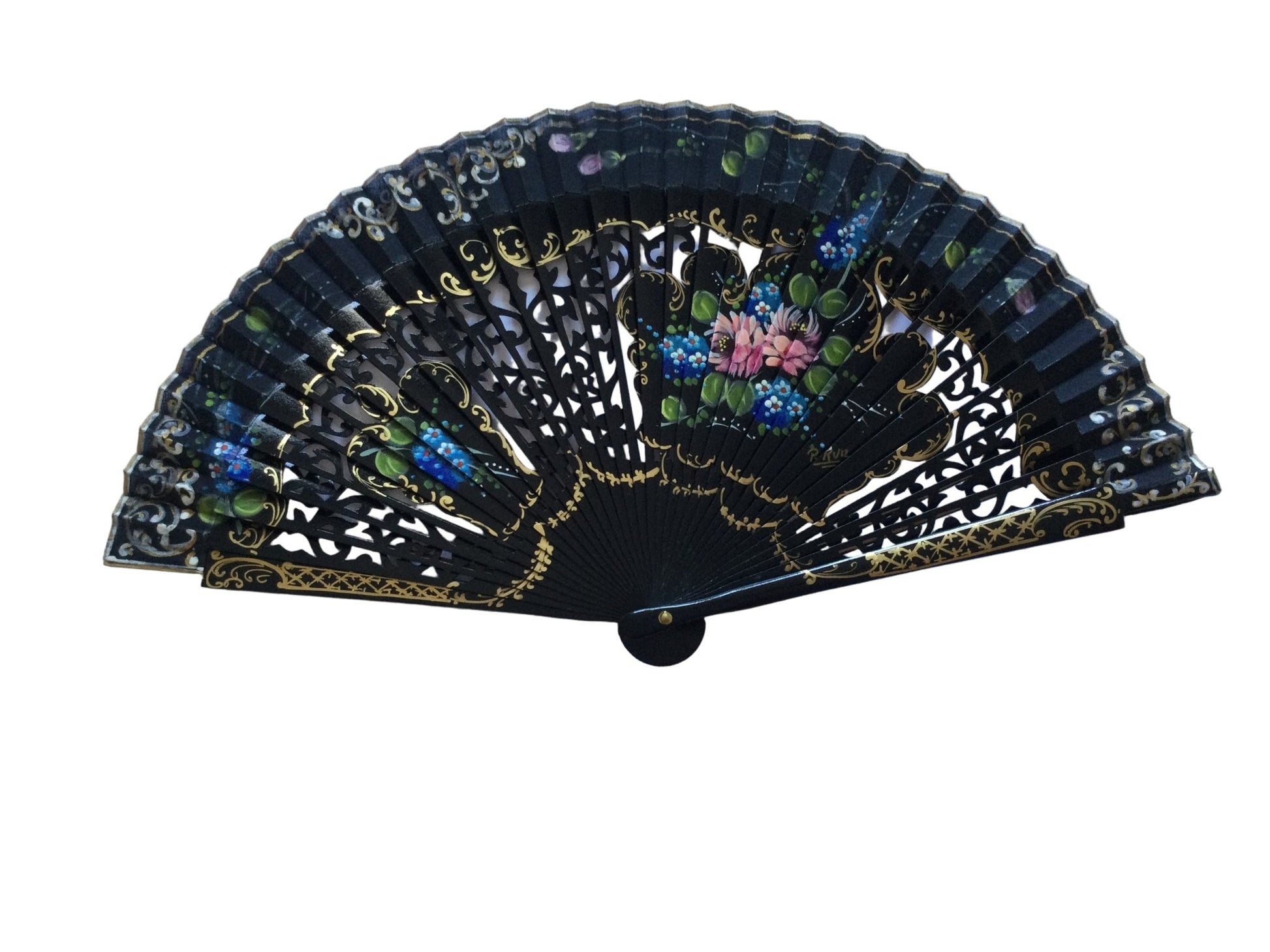 Abanico de madera de color negro con decoración floral.