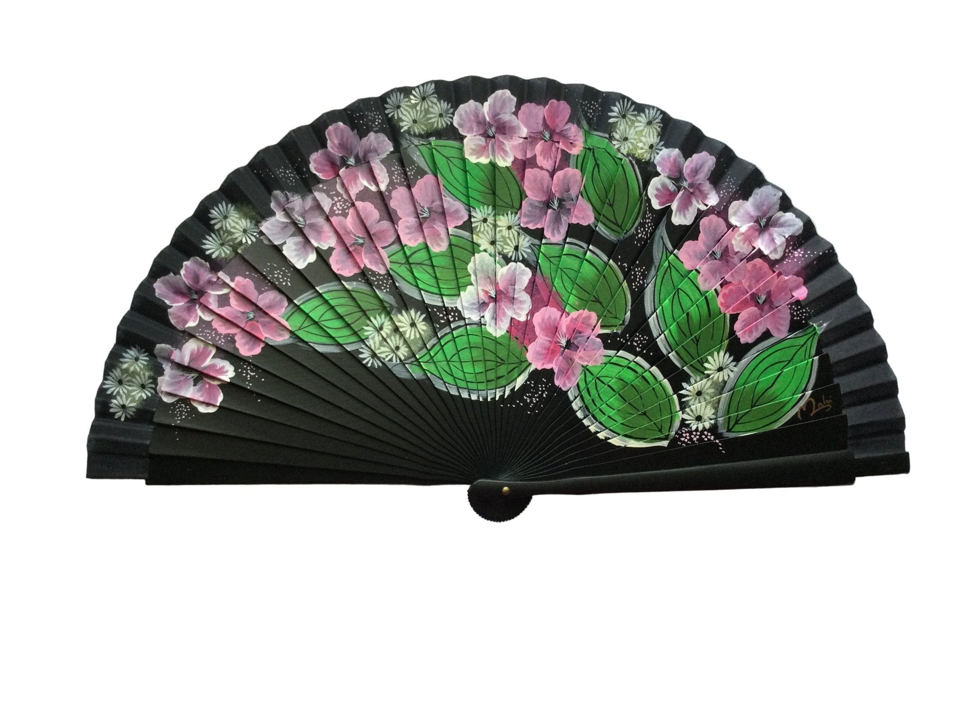 Abanico de madera de color negro con decorado floral.